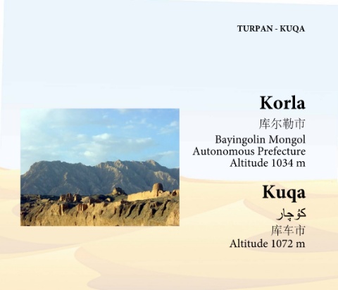 TURPAN - KUQA Korla 库尔勒市 Bayingolin Mongol Autonomous Prefecture Altitude 1034 m -- ___ iiii ___ _ ___ _ .... ___ Kuqa رﺎﭼۇﻛ 库车市 Altitude 1072 m
